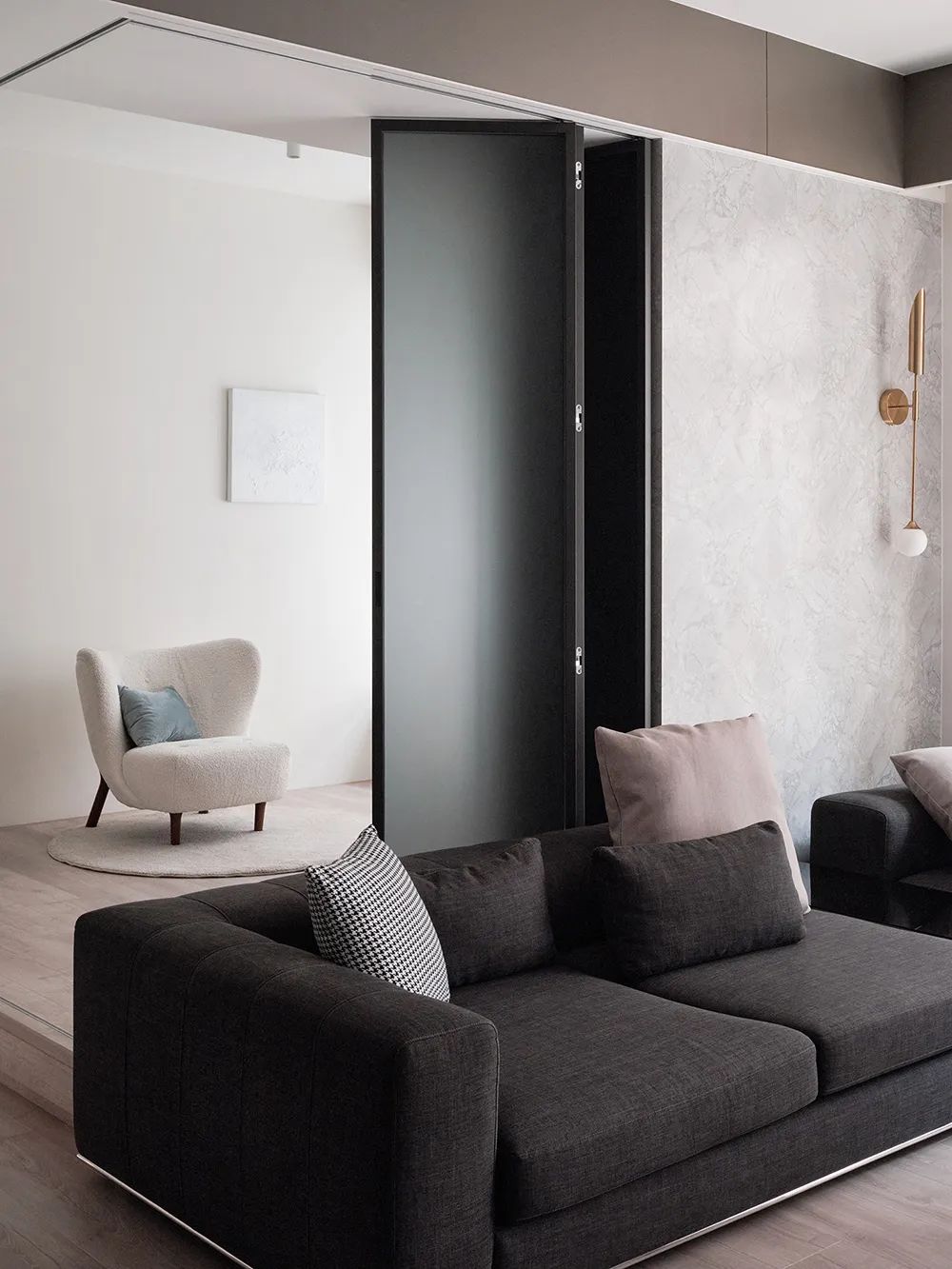 改造前,沙发后是一面实体墙,后改为折叠门。折叠门后面是一个独立房间,可以看书、独处;打开门后,便和客厅融为一体。